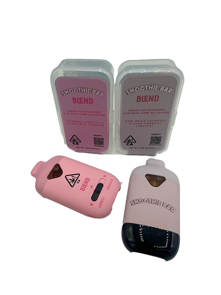 Take your vaping experience to the next level with Smoothie Bar, the cutting-edge 2-gram dual chamber vape that lets you mix and match strains for a fully customizable high. This sleek, high-tech device not only delivers premium cannabis oil and curated strain pairings, but it also features a battery life indicator, ensuring you always know how much charge remains. Plus, the innovative blend feature allows you to seamlessly combine both strains for a unique, personalized vaping experience.